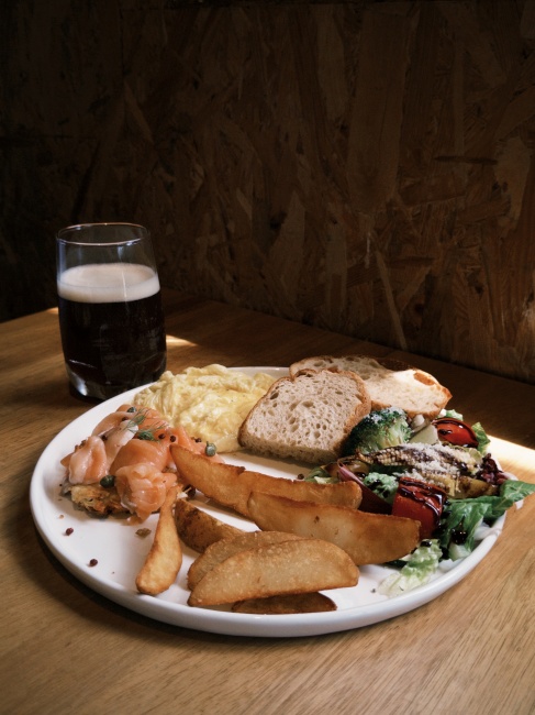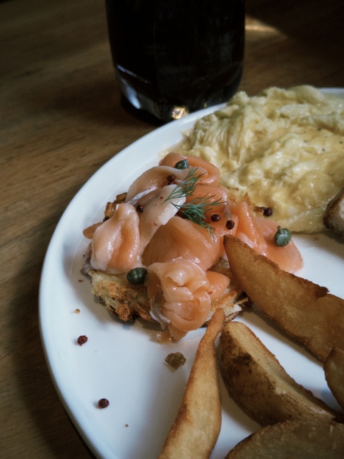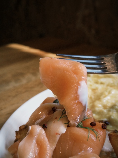 煙燻鮭魚底部的手撕薯餅,是將馬鈴薯切成條狀之後再下去煎炸,與普通薯餅或馬鈴薯泥相比又多了點口感上的層次,不管是單獨吃、還是搭配鮭魚一起吃都不會搶味。