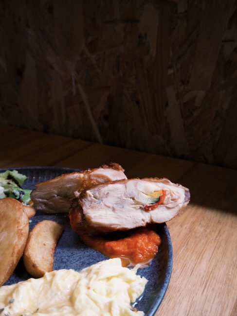 主餐雞腿肉捲,包裹了彩椒、節瓜、玉米筍,吃起來除了雞肉香,還多了份蔬菜的甜味。然後外皮煎得金黃微酥,雞肉本體經過舒肥處理,不管是搭配歐式麵包還是炒蛋等配菜,都相當合適。