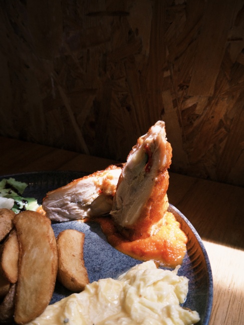 盤內組合看起來好像都相同,因此我就兩道依序這樣介紹了。隨餐所附的是契形馬鈴薯條,炸得外酥內綿,保留馬鈴薯皮的香氣與內裏的濕潤感,簡單撒上適量鹽巴調味,不需額外再沾醬就很好吃。