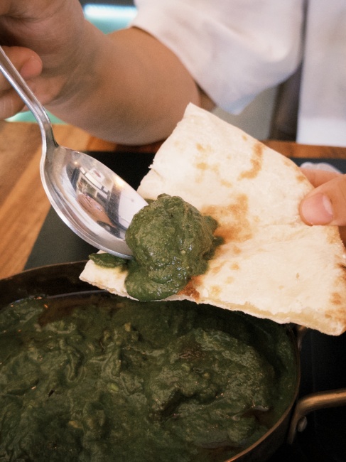 用菠菜打成醬的羊肉咖哩,雖然顏色一開始會讓人有點猶豫,但吃過之後真的有讓人眼睛為之一亮。整體來說菠菜味並不明顯,多為羊肉本身的肉香氣,以及印度咖哩特有的香料味,肉也燉得很嫩很好吃,沾著烤餅或淋在飯上都很適合,大力推薦給跟我一樣同為羊肉愛好者的人。