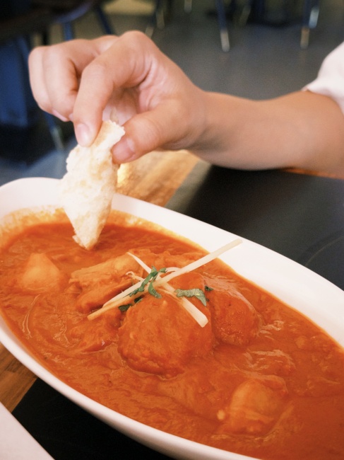 烤餅柔軟中帶點微焦香氣,塗上奶油之後香氣更加分,雖然單吃就已經很好吃,但沾了咖哩之後直接升級,一口接一口超有快感,很容易會不小心吃太多,完全可以當作主食來配著咖哩吃,會讓人想要一直加點的那種合拍口感。