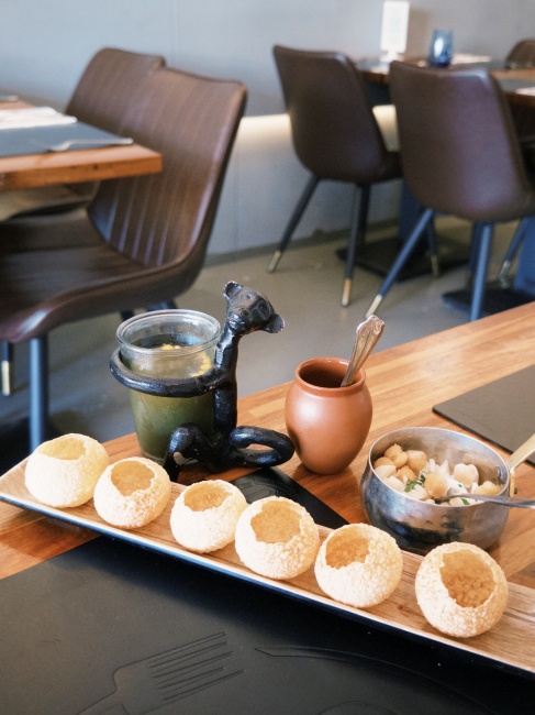 DIY依序放入鷹嘴豆、馬鈴薯塊,並加入兩杓羅望子醬,最後再把特調薄荷汁加滿,就可以一口一個直接品嘗,按部就班完成後樂趣滿滿。而吃起來的口感與味道也同樣讓人驚艷,除了外皮的脆口感之外,醬汁帶來酸甜交織的衝擊感也很特別,最後再感受到馬鈴薯與鷹嘴豆的飽滿,整個都開味起來了,相當有層次感的一道在地小點。