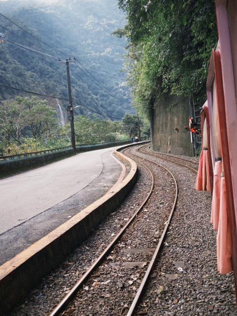 搭乘烏來觀光台車沿著山坡繞著蜿蜒的山路行駛,轟隆隆的鐵軌聲與眼前美景相襯也別有一番風味,讓人有種相當愜意的氛圍感。