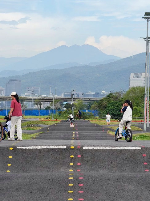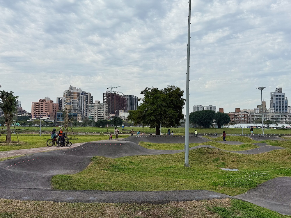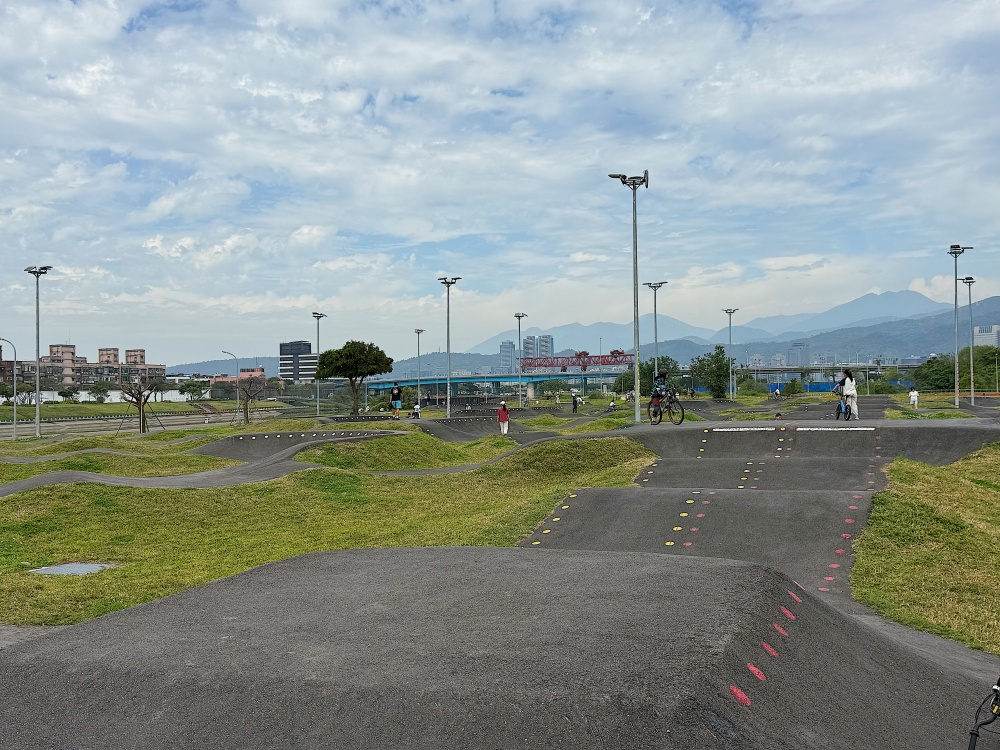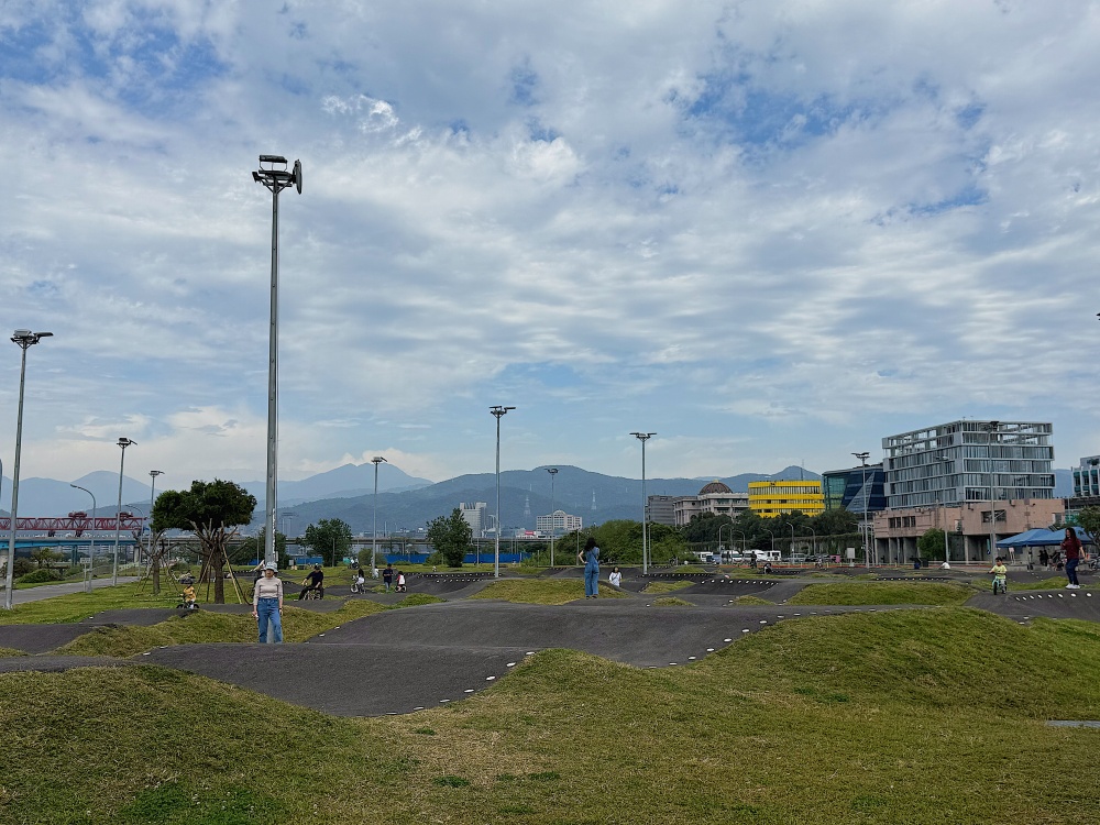 今天溜小孩的地點是彩虹河濱公園輪狀車練習場,為112年才正式啟用的堤外休憩設施,除了是越野玩家的練習場以外,也是許多爸媽會帶小孩來體驗Pump Track運動的好去處。