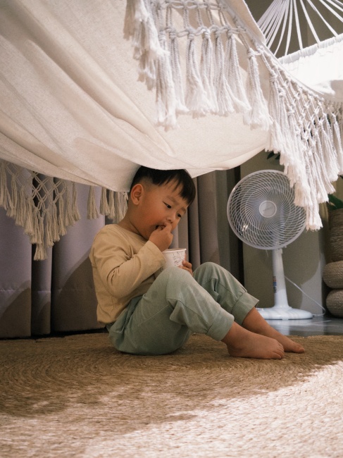 旁邊緊靠著滿版落地窗的吊床,除了可以很chill的躺著看園區景色之外,小朋友吃點心或躲在下面當作秘密基地都很適合。